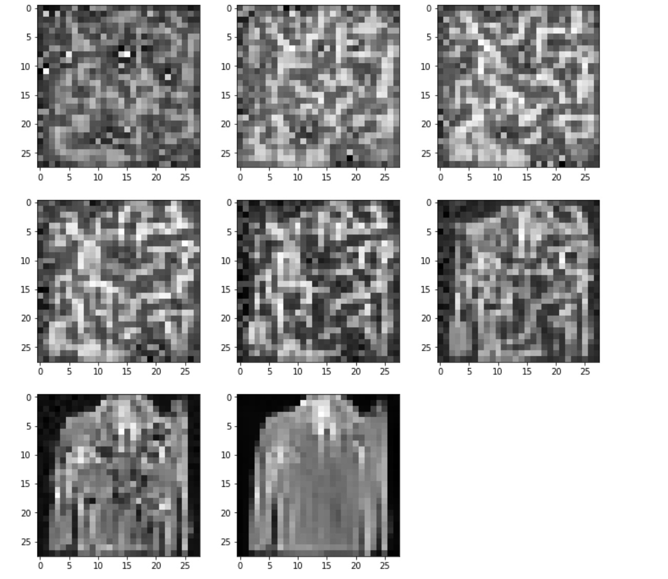The new visualization shows some features of the output much quicker than the traditional visualization. All of the MNIST fashion pictures which the model was trained on are on a black border. The new method has this black border more prominent than the new visualization. Unfortunately, the new method does not show any large improvement over the traditional method. This could be due to the ultra-simplistic diffusion model created or to flaws in this approach.