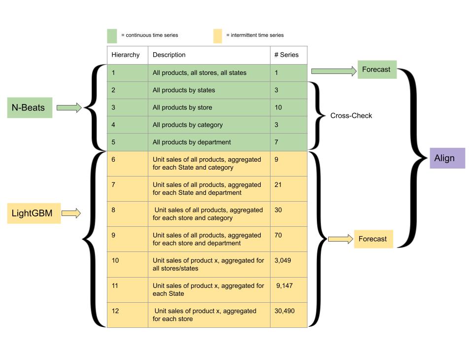 The main method this paper uses is combining two machine learning algorithms, N-BEATS and LightGBM, for different tasks within the hierarchical-forecasting-with-alignment framework. N-BEATS uses a deep stack of full-connected layers: 30 stacks of depth 5 and a total depth of 150 layers. It's composed of two residual branches to form a doubly residual stacking architecture: one runs over the backcast prediction of each layer, the other the forecast branch of each layer. This allows it to run without a massive data source or utilizing extensive feature engineering. The authors use the GluonTS implementation of N-BEATS rather than the original, as it requires less hyperparameter tuning of the variable representing the historical range of length for each selected time series. GluonTS instead reduces computational requirements by randomly selecting a time series and a starting point within it. This paper trains N-BEATS using the top five levels data. LightGBM uses gradient boosting decision trees: it first uses the decision tree algorithm to partition inputs into tree structures. Since the decision strategy for trees is so weak, it uses gradient boosting algorithms to aggregate predictions and improve performance, making the ultimate prediction based on the tree. This is used for the bottom level to model the intermittent time series.